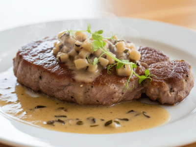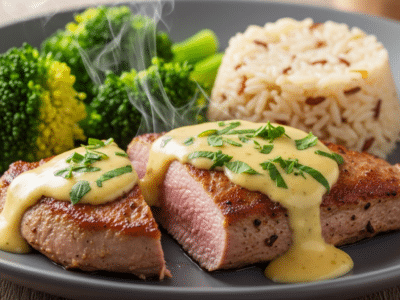 Filet mignon de porc sans moutarde, sauce crémeuse aux herbes